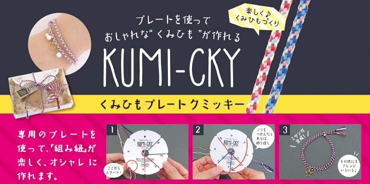 プレートを使っておしゃれな”くみひも”が作れるクミッキー。 ミサンガやラッピング素材に活用してください。 作り方説明書には2色で作る場合の配色例と3色で作る場合の配色例が記載されています。 いろんな色でアレンジしてみてくださいね。